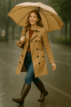 おしゃれなレインブーツを履いて、雨の中でも楽しそうに傘をさして歩いている20代外国女性 ファッション