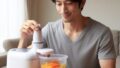 30代日本人男性がフードプロセッサーとハンドブレンダーで食材を切っている キッチン用品