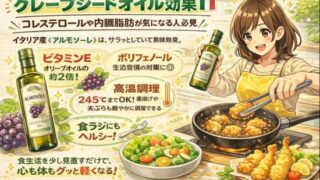 グレープシードオイルの効果を知りたい方へ。コレステロールが気になる50代女性に人気の健康オイル。ノンコレステロールでビタミンEも豊富。揚げ物や炒め物を我慢せず、体にやさしい食生活を始めたい方におすすめ。料理の味も軽やかに仕上がります。