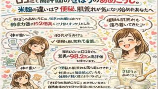 血糖値の上昇や便秘、肌荒れが気になり始めた40~60代女性に人気の甘味料「あめこうじ」。84%が高評価の理由は、自然な甘さと発酵の力。白砂糖に代わるやさしい選択として注目されています。リアルな口コミをもとに、その効果や味、気になる点まで詳しく解説します。